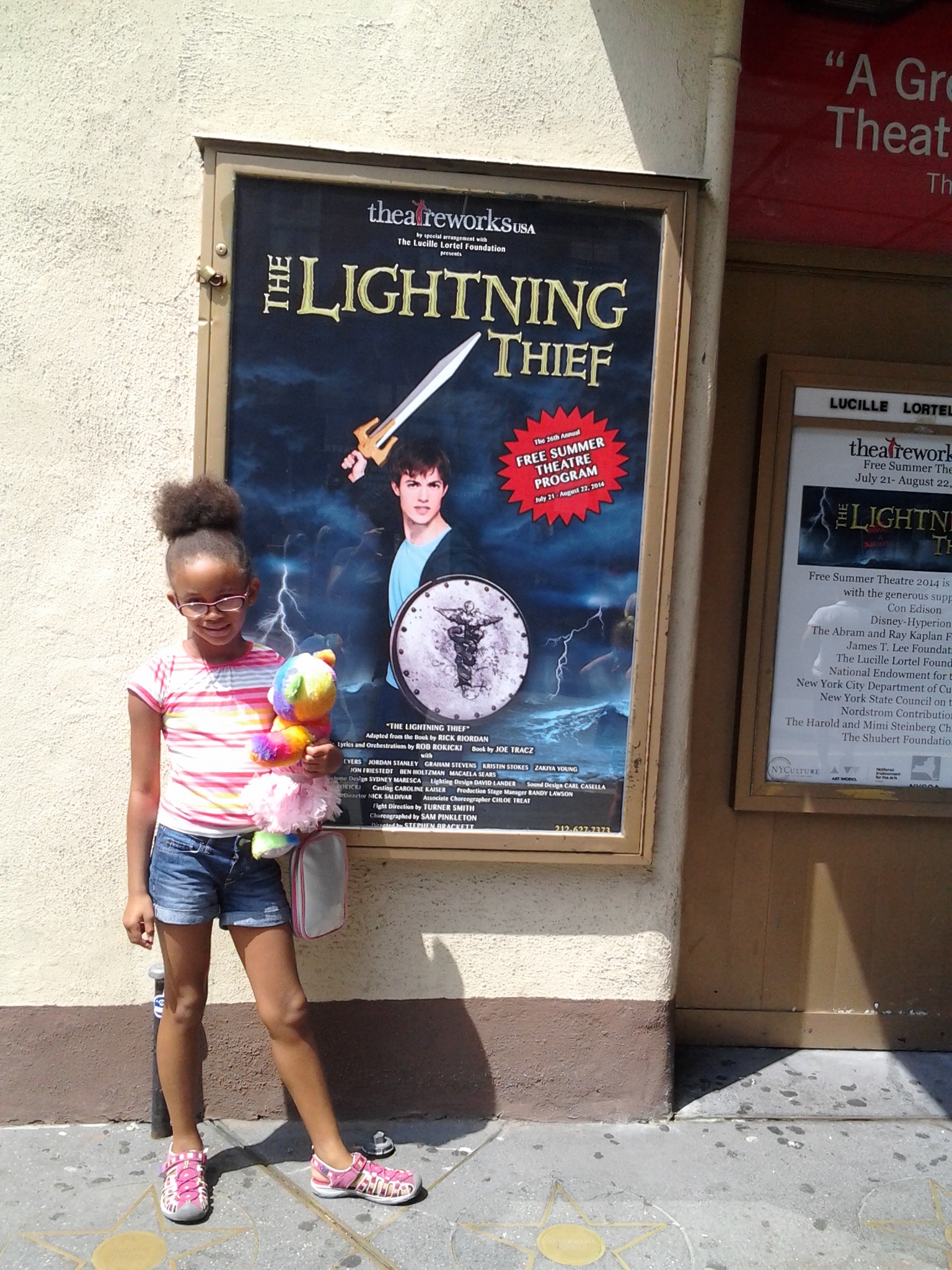 I’m all about enriching experiences so I checked it religiously (though I must admit, I relied on it heavily during the start of our staycation and honestly didn’t even bother to revisit the list we made together until mid-week). However, on the very first day we set out to have the most amazing staycation in all of the universe, MP did supply us with one of the things on our list: Broadway! Okay, well it was off-Broadway, but it was still superb…and best of all, it was FREE…which if you have been keeping track, was criteria numero uno on our list. We saw a performance of : The Lightning Thief at the Lucille Lortell Theatre in Greenwich Village. It was superb! At the end of each musical number, Kam kept asking me, “Is there more?Is there more?” When I told her yes and questioned why she asked, she said it was because she liked it and didn’t want it to end. It was also from MP that we learned of free fishing in Hudson River Park (which btw has got to be one of the best kept secrets in the city!). It’s a humongous park with lush lawns, great views of the Manhattan skyline, dog runs, beach volleyball, tennis, and the list goes on. We were allowed to fish at half-hour increments. The entire fishing time was for an hour-and-a-half. If I signed Kam up each time, she could have potentially fished uninterrupted for 9o minutes. Day one got off to a pretty good start. Making a list to keep us on track certainly helped!
