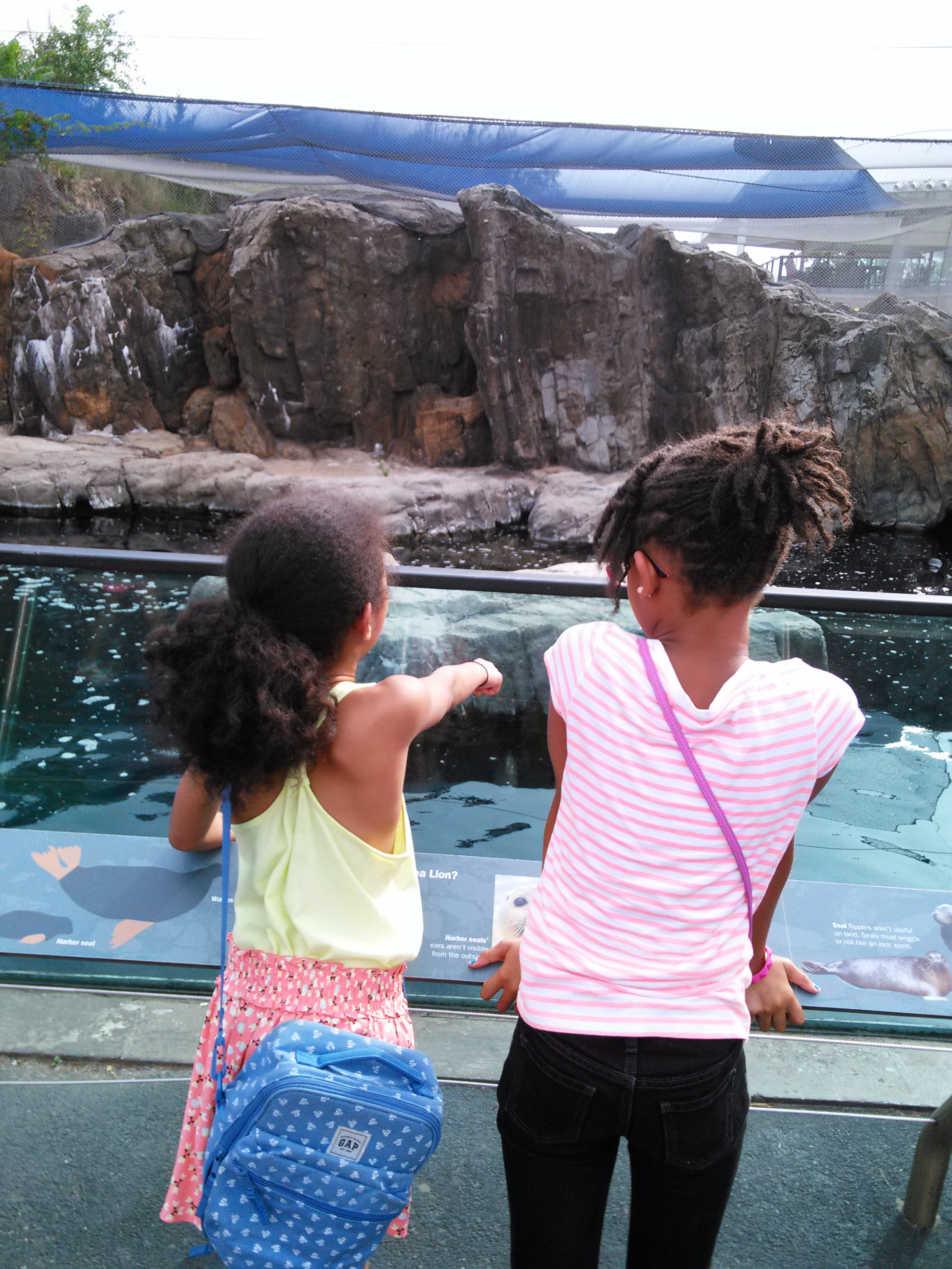In spite of the current renovation (that should be completed some time next year) that has caused some parts of the aquarium to be off-limits, we had a pretty swell time. We were able to take in the exquisite coral reefs. We stared in wonder at the assortment of fish swimming around in a frenzy who paid us absolutely no mind. They were used to being on display and were therefore unfazed by the bugling eyes, opened mouths, and flashing cameras tracking their every move. There were various stations that displayed fish from around the globe. It was clear that the fish was the girl’s favorite part. They were reluctant to leave when I attempted to usher them elsewhere so we could take in all we could in less than an hour and so that I could get the most out of my $3. There were still sharks (which was my personal fave) and penguins to see. There would be no sea lion show for us. By the time we got there, all the seats had already been filled.